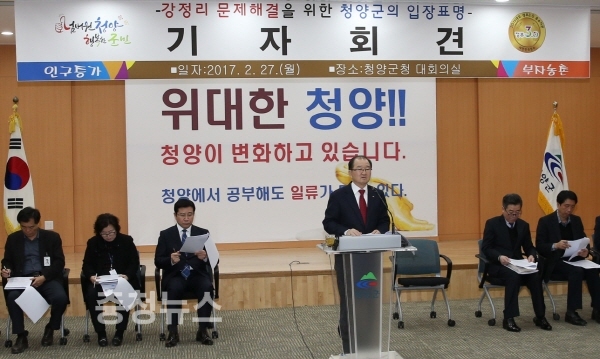이석화 군수는 27일 군청 대회의실에서 기자회견을 열고 ‘강정리 폐기물매립장 반대 주민대책위원회 강정리 석면·폐기물 공동대책위원회’에서 청양군이 ㈜보민환경과 유착해 특혜를 주고 비호하는 양 허위 주장에 대한 입장과 그동안의 진행상황을 발표했다