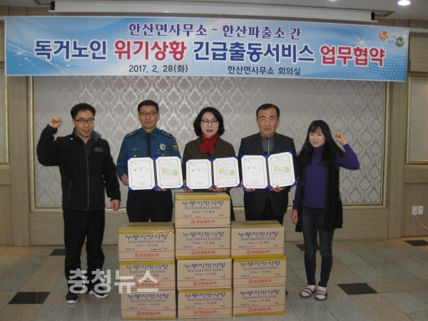 충남 서천군 한산면(면장 김봉녀)과 한산파출소(소장 안병문), 한산면지역사회보장협의체(위원장 박관구)는 28일 한산면사무소 회의실에서 독거노인 긴급출동서비스 업무협약(MOU)을 체결했다.