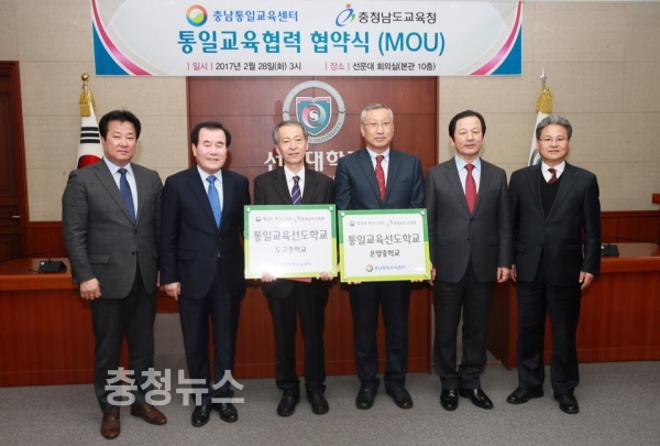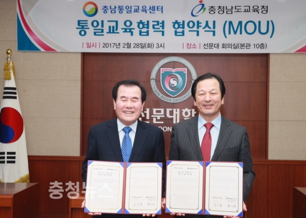 충남도교육청(교육감 김지철)과 충남통일교육센터(센터장 황선조 선문대 총장)는 28일 선문대학교 본관 회의실에서 통일교육 활성화를 위한 업무협약식을 가졌다.