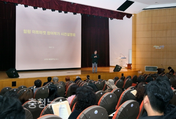 이날 설명회는 힐링아트마켓 참여 작가 100여 명이 참석한 가운데, 배재대학교 관광이벤트경영학과 김주호 교수가 발표자로 나서 아트마켓 해외운영 사례 및 운영방법에 대해 발표한 후 질의응답 시간으로 진행됐다.