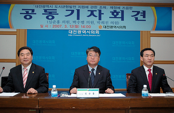 대전시 의회 부의장 심준홍(대덕3) 박수범(대덕2) 박희진(대덕1) 의원 등 은 12일 오후 2시 시의회에서 기자회견을 갖고 “어느 도시든지 도시화의 역기능 현상과 도시개발의 부작용은 있게 마련”이라면서 “이의 극복을 위해 도시균형발전 지원 조례 제정을 추진하겠다”고 밝혔다.
