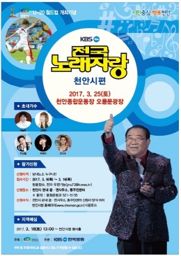 U-20월드컵 천안 경기 성공개최를 기원하며 열리는 이번 행사는 국민MC ‘송해’의 사회로 예비심사를 거쳐 본선에 진출한 15팀이 노래 솜씨를 뽐낸다.