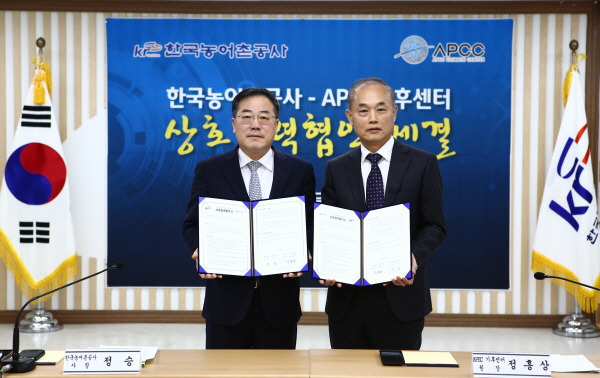 한국농어촌공사(사장 정승)와 APEC기후센터(원장 정홍상)는 3일 경기 수원시 농어촌공사 토지개발사업단에서 농업·농촌 분야 기후변화 대응방안을 공동으로 추진하기 위해 업무협약을 체결했다.