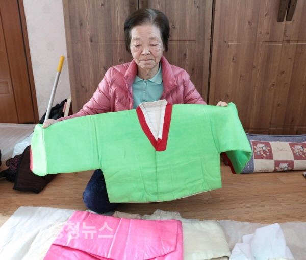 올해 90세인 유기준 할머니는 70여년 전 남편(고 정진우)과의 혼례 당시 혼수로 해 온 솜을 넣은 색동저고리와 꽃분홍색 저고리, 옥빛 치마저고리 등 1940년대 복식류 총 7점을 기증했다.
