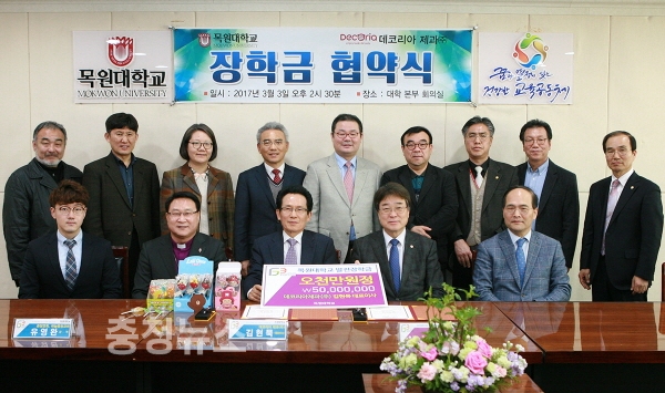 목원대학교(총장 박노권)는 본부 회의실에서 데코리아제과(주) (대표이사 김현묵 )와 장학금 기탁 협약식을 체결하였다고 6일 밝혔다.