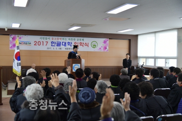 충남 논산시(시장 황명선)가 운영하는 따뜻한 행복공동체 ‘동고동락(同苦同樂)’프로젝트 중의 하나인 ‘한글대학 입학식’이 지난 3월 2일 채운면을 시작으로 본격 출발했다.