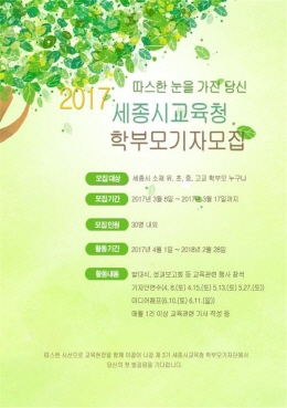 활동기간은 오는 4월부터 2018년 2월까지 11개월간이다. 시교육청은 이 기간동안 기자단 활동을 위한 연수를 제공하고, 기사에 대한 소정의 원고료 지급, 우수 학부모 기자에 대한 교육감 표창 등 다양한 활동 혜택을 부여할 예정이다.