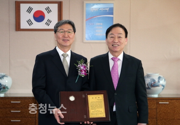 설동호 대전교육감이 6일, 교육감실에서 대전교육발전을 위해 헌신하고 명예퇴직하는 이중흔 부교육감에게 송공패를 전달했다.