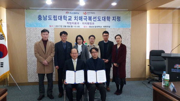 충남도립대학교(총장 구본충)가 6일 대회의실에서 충청남도광역치매센터와 충청남도 치매극복선도대학 지정과 관련하여 업무협약을 체결했다.