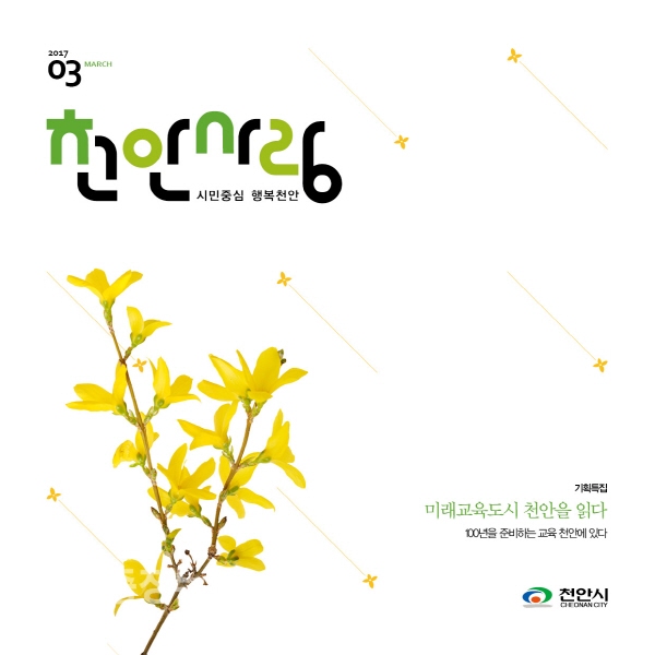 우선 제호의 글자크기를 크게 키우고 색감을 입혀 시민들의 시선을 한눈에 사로잡을 수 있도록 변경하고 표지 하단에는 기존에 없던 시 로고(CI)를 삽입해 천안시 소식지임을 강조함과 동시에 봄에 어울리는 시화 개나리를 삽입했다.