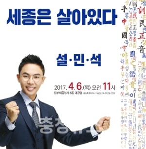 세종시문화재단(대표이사 인병택)이 ‘2017 세종여민락아카데미’ 개설 기념으로 설민석의 특별강연회를 개최한다. 강연은 ‘세종은 살아 있다’를 주제로 다음달 6일 오전 11시 정부세종청사 대강당에서 진행된다.