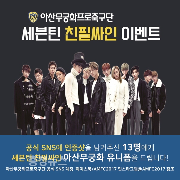 아산 무궁화프로축구단(구단주 복기왕)이 오는 11일 오후 5시 이순신종합운동장에서 열리는 첫 홈 개막전을 기념해 대세돌 ‘세븐틴’의 싸인이 담긴 실착 유니폼을 증정하는 이벤트를 진행한다.
