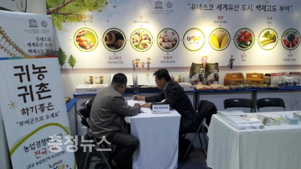 충남 부여군(군수 이용우)은 지난 10일~12일까지 3일간 서울 양재동 aT센터 제1전시장에서 개최되는 ‘2017 성공귀농 행복귀촌 박람회’에 참가하여 귀농·귀촌을 희망하는 도시민 유치에 들어갔다.