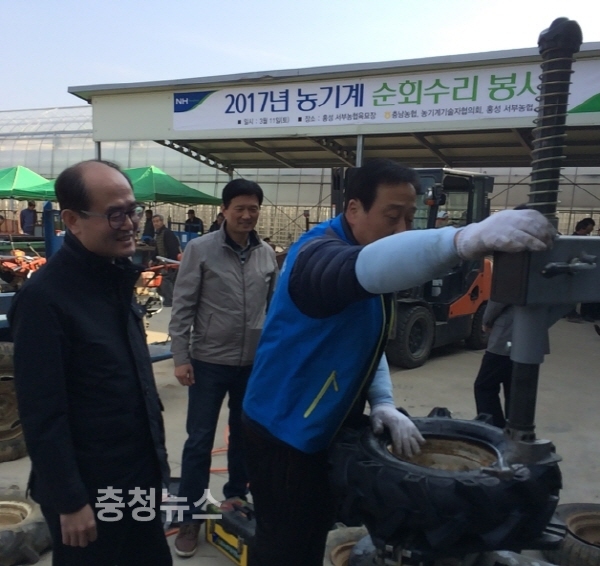 충남농협은 지난 2016년도 4차례에 걸친 농기계 순회수리 현장지원 봉사에 이어 금년도 처음 실시하는 농기계 수리봉사는 농기계의 수리비 부담과 서부면 지역내에 농기계 센터가 없어 수리에 어려움을 겪고 있는 농업인들의 불편을 덜어주고자 마련했다.