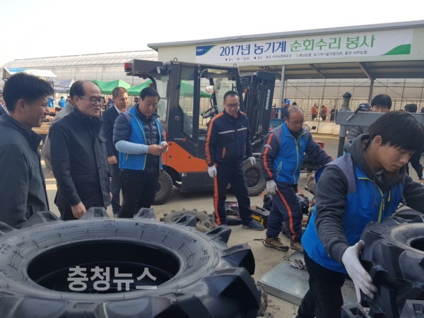 농협 충남지역본부(본부장 유찬형)는 본격적인 영농철을 앞두고 농업인들이 농기계를 사용하는데 불편함을 해소하기 위해 11일 홍성 서부농협에서 농기계 순회수리 봉사활동에 나섰다.