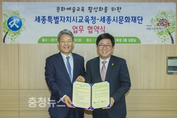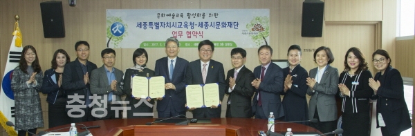 세종특별자치시교육청(교육감 최교진)은 13일 교육청 상황실에서 세종시문화재단(대표이사 인병택))과 문화예술교육 상생발전을 위한 업무협약(MOU)을 체결했다.