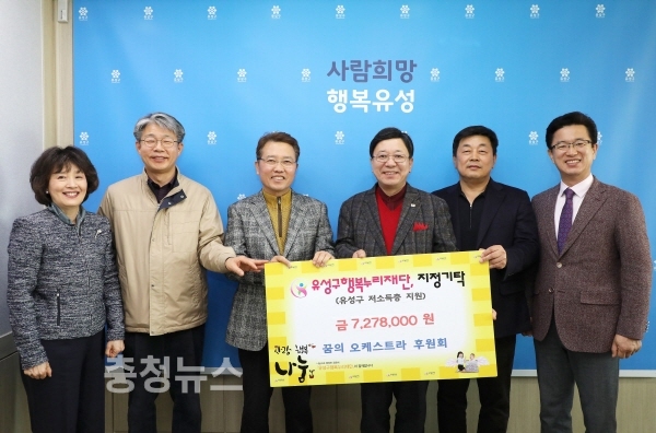 대전 유성구(허태정 구청장)는 14일 유성문화원 꿈의 오케스트라 후원회로부터 후원금 727만원을 기탁 받았다고 밝혔다.