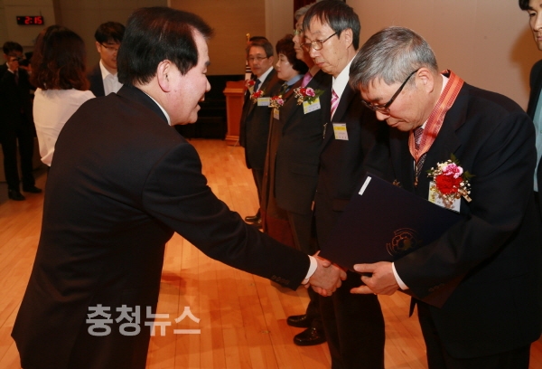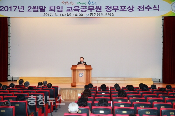 충남도교육청(교육감 김지철)은 14일 본청 대강당에서 퇴임교육공무원 및 가족들이 참석한 가운데 올해 2월말 퇴임 교육공무원에 대한 정부포상 전수식을 가졌다.