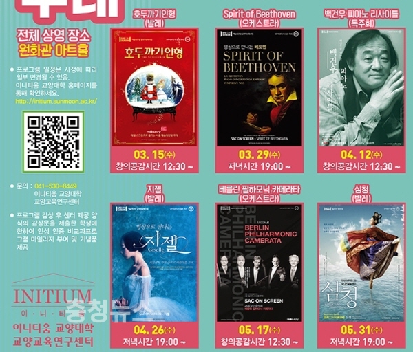 선문대 이니티움 교양대학은 예술의전당과 상호협약을 맺고 초고화질 공연 영상 6편을 무료 상영한다. 학생이나 지역 주민, 누구나 참석이 가능하다.