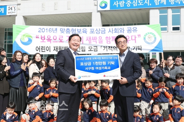 이번 기탁금은 보건복지부주관 ‘2016년 맞춤형 보육 평가’에서 전국 지방자치단체 중 최우수 기관으로 선정되어 받은 포상금(1천만 원) 전액이다.