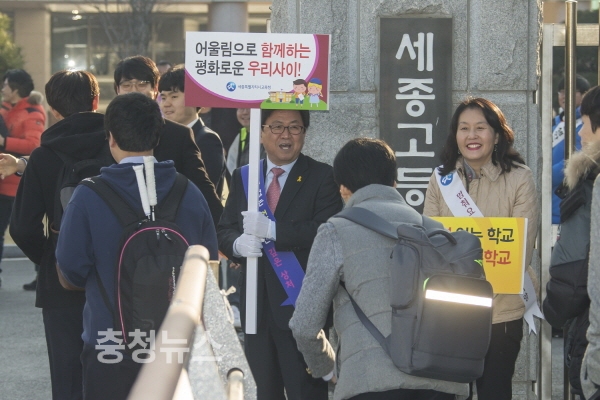 지난 3월 14일 최교진 교육감이 조치원중과 세종여고에서 등굣길 아침맞이 학교폭력 예방활동에 참여하고 있는 장면