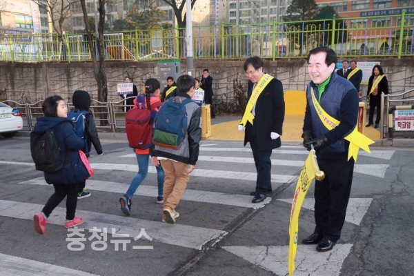 김지철 충남교육감이 공주 신월초등학교 앞에서 교통안전 캠페인을 실시하고 있다.