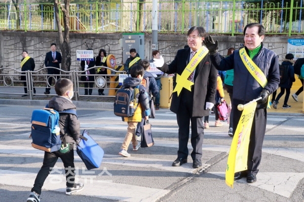 김지철 충남교육감은 3월 한 달간 진행되고 있는 충남도교육청의 개학기 학교주변 교통분야 안전점검 기간을 맞아 15일 공주 신월초등학교에서 정년퇴임 후 8년째 아침 교통지도 봉사를 펼치고 있는 조동수 전 교장 등 신월초 교육가족과 함께 등굣길 교통안전 캠페인을 실시했다.