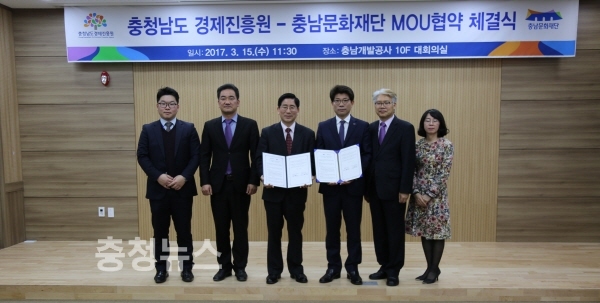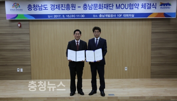충남문화재단(대표이사 이종원)은 15일, 충남개발공사 10층 대회의실에서 충청남도경제진흥원(원장 나윤수)과 문화예술과 지역경제 활성화에 기여하기 위한 업무협약을 체결했다.