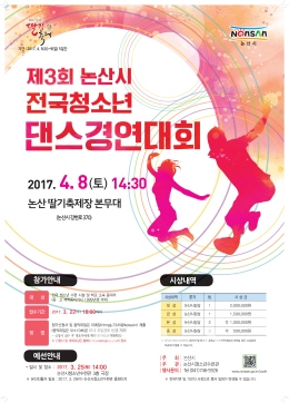 충남 논산시(시장 황명선)는 다음달 4월 8일, 2017 논산딸기축제장 본무대에서 '제3회 논산시 전국청소년 댄스경연대회' 를 개최한다.
