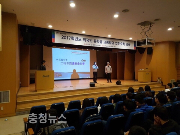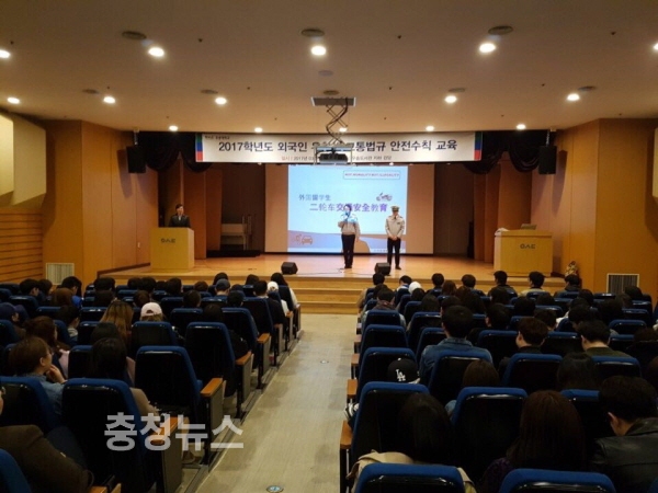 대전동부경찰서(교통안전계장 경감 김창준)는 16일 관내 우송대학교 강당에서 중국인 유학생 100명에게 교통안전교육을 실시하였다.