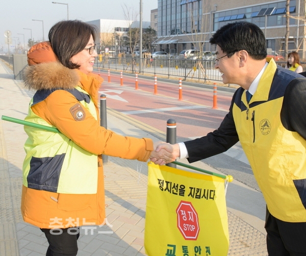 이춘희 세종시장은 16일 오전 글벗초등학교에서 안전도시위원회 위원들과 함께 통학로 안전시설을 현장점검하고 학교 주요 횡단보도에서 등굣길 교통지도를 실시했다.