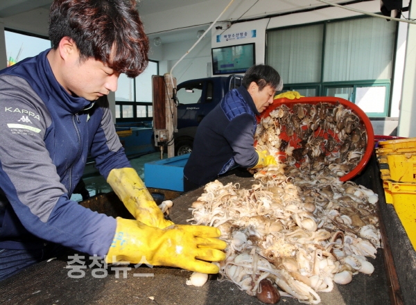 16일 충남 태안군 남면 몽산포항에서 어민들과 위판장 직원들이 수확된 주꾸미를 선별하고 있다.