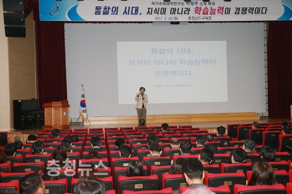 충남도교육청(교육감 김지철)은 20일 본청 대강당에서 전 직원이 참여한 가운데 ‘통찰의 시대. 지식이 아니라 학습능력이 경쟁력이다’ 라는 주제로 박형주 국가수리과학연구소장을 초청해 특강을 실시했다.