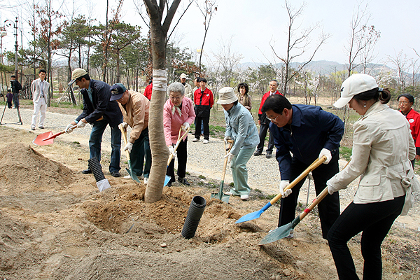박 시장은 이날 사재 100만원을 출연, 20년생 느티나무 2그루를 구입해 부모님(박규태, 정영식) 나무 1그루와 아들 용현군과 딸 소영양을 위한 자녀들 나무 1그루를 각각 심었다.