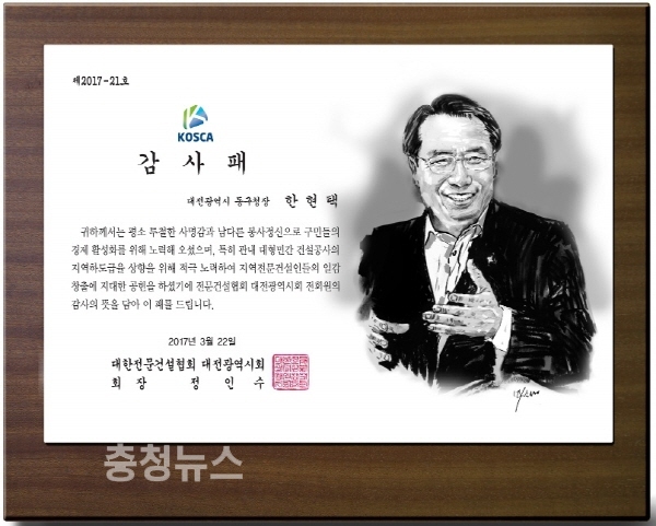 대한전문건설협회 대전광역시회에서 한현택 동구청장에게 수여한 감사패