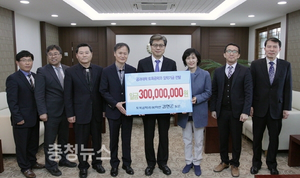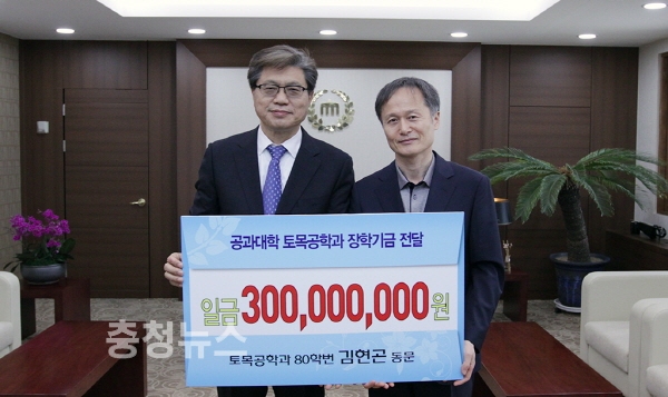 김현곤 동문(토목공학 80학번)은 22일 오덕성 총장을 방문해 토목공학과 장학기금으로 3억원을 약정했다. 김현곤 동문은 매년 1,000만원씩 30년간 후배들을 위해 장학기금을 기부하기로 약속했다.