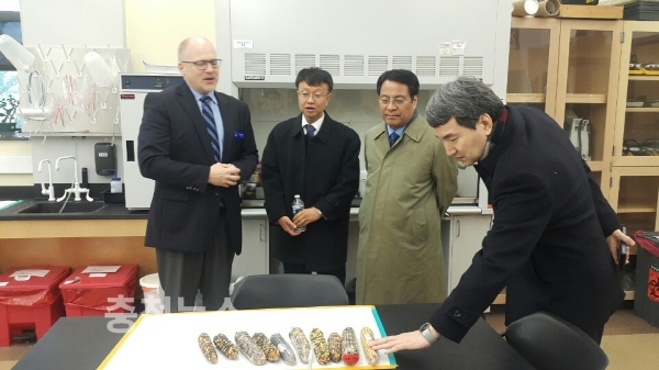이덕훈 한남대 총장(오른쪽 두번 째)과 한남대 방문단이 미국 윌슨칼리지 실험실을 둘러보고 있다.