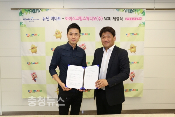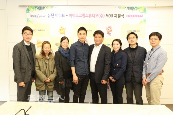골프존유원그룹의 ㈜뉴딘미다트(대표이사 김민광)가 지난 22일, EBS에서 방영중인 애니메이션 ‘두다다쿵’을 제작한 3D 애니메이션 제작사 아이스크림스튜디오㈜(대표이사 최병선)’와 캐릭터를 활용한 미디어아트 및 공간 개발 사업 협력을 위한 업무협약을 체결했다고 밝혔다.