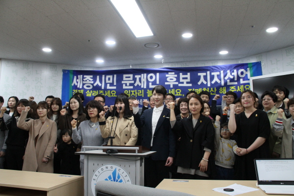 세종 각지에서 자발적으로 모여 결성된 ‘세종더불어포럼’ 50여명은 23일 세종시청 브리핑룸에서 더불어민주당 문재인 후보에 대한 공식 지지 입장을 밝혔다.