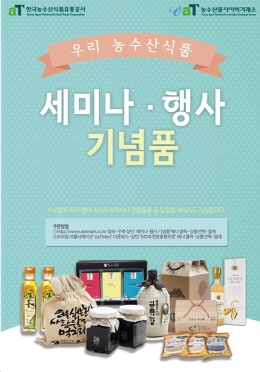 한국농수산식품유통공사(사장 여인홍) 농수산물사이버거래소(소장 황형연)는 각종 행사 및 세미나 개최 시 활용도가 높은 우리 농식품 기념품 온라인 전문 몰을 오픈 하였다.