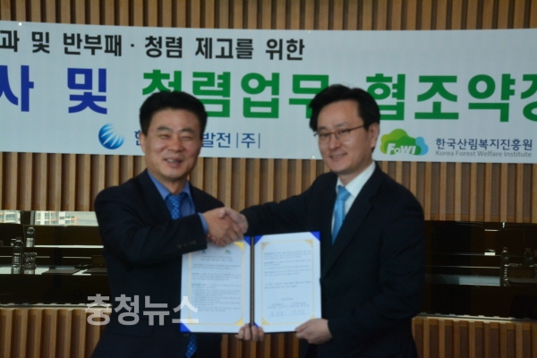 한국산림복지진흥원(원장 윤영균)은 23일 한국중부발전(주)(사장 정창길)과 충남 보령시 한국중부발전 회의실에서 ‘감사 및 청렴 협조를 위한 업무협약(MOU)을 체결했다고 밝혔다.