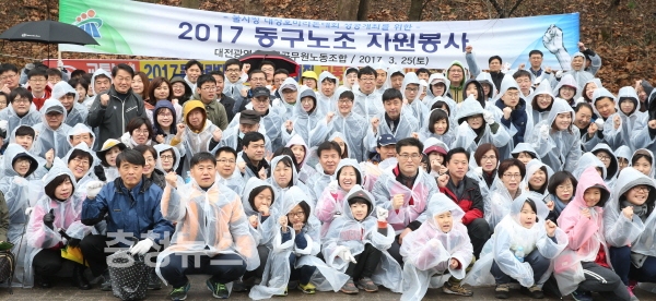 대전 동구청 공무원노동조합(위원장 신재우)은 지난 25일 비가 오는 궂은 날씨에도 300여 명의 조합원과 가족 등이 참여한 가운데 오는 4월 1일 열리는 2017년 물사랑대청호마라톤대회의 성공개최 기원과 함께 깨끗하고 쾌적한 대회여건 제공에 기여코자 신상동 신상교차로~방아실 인근까지 회인선 벚꽃길을 대상으로 쓰레기를 줍고 적치물을 치우는 환경정화 자원봉사를 펼쳤다.