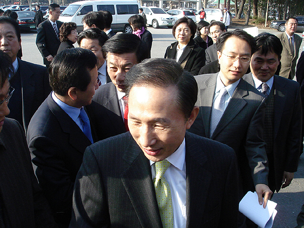 이명박 공항에서 곳바로 대전으로 내려와 뒤져있는 지지율 회복 지원 거리 유세로 승부