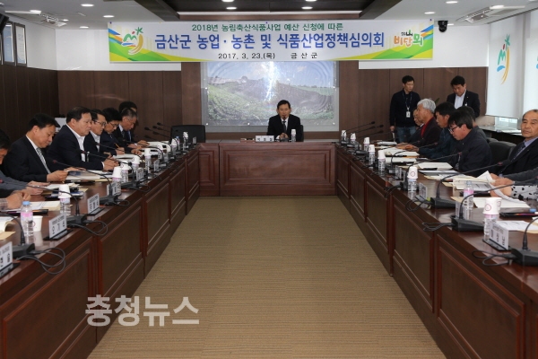 충남 금산군은 지난 23일 군청 2층 상황실에서 박동철 군수를 비롯한 농업·농촌 및 식품산업정책 심의위원과 관계공무원 등 총 50여명이 참석한 가운데 2018년 농림사업 예산신청에 따른 농업⋅농촌 및 식품산업정책심의회를 개최했다.