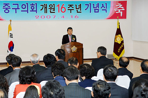 대전시 중구의회에서는 4월 16일 오후 2시 30분에 구청 후생관에서 이은권 중구청장, 이운우 중구의장 및 의원, 중구의정회, 기관▪단체장, 유공구민, 지역주민 등 150여명이 참석한 가운데 중구의회 개원 제16주년 기념행사를 가졌다.