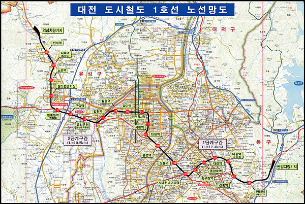 대전도시철도 1호선은 지난 1996년 10월 착공 이후 10년 6개월만으로 지난해 4월 1단계구간(판암역∼정부청사역)을 개통한 이후 1년만에 완전개통을 보게 됐다.