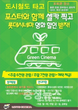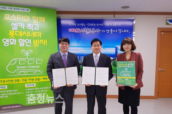 공사와 롯데시네마는 도시철도를 이용한 고객이 롯데시네마 대전관(괴정동), 둔산관(월평동)과 가까이에 있는 도시철도 역사 승강장 포토존에서 셀프 인증사진을 촬영하여 당일 영화관에 제시하면 동반 1인까지 주중 3천원, 주말 4천원을 할인하여 영화를 관람할 수 있는‘그린시네마’이벤트를 진행한다.