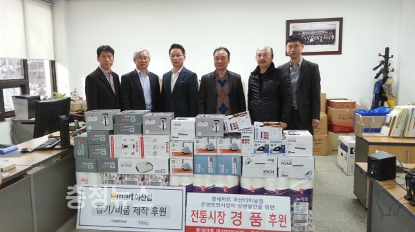 롯데마트 아산터미널점과 이마트 아산점은 27일 상인회 사무실에서 온양온천시장 활성화를 위한 물품 전달식을 가졌다.