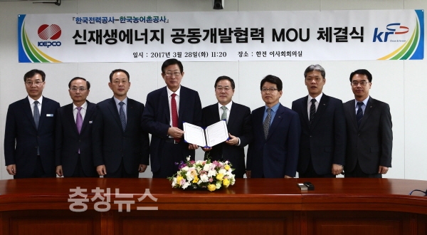 한국농어촌공사(사장 정승)와 한국전력공사(사장 조환익)는 신재생에너지 공동 개발을 위해 28일 전남 나주시 한국전력공사 본사에서 업무협약을 체결했다.