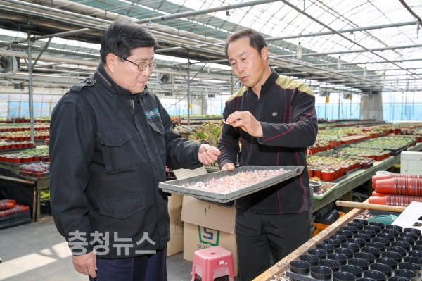 한상기 태안군수가 29일 태안읍 평천리의 시범사업 농가 2개소를 방문해 영농현장을 둘러보고 지역 농업의 경쟁력 확보 방안을 논의했다.